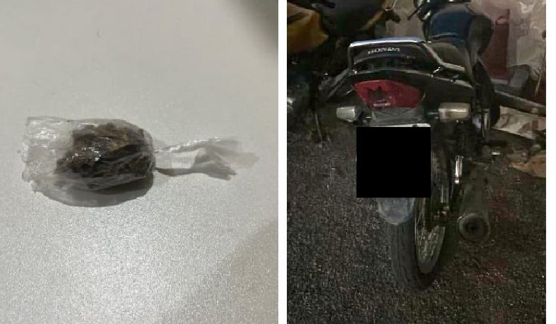 Durante a tentativa de fuga, ele perdeu o controle da motocicleta e caiu. Mesmo com escoriações provocadas pelo acidente, foi possível realizar a abordagem. Durante a revista pessoal, os policiais encontraram uma porção de uma substância semelhante à maconha.