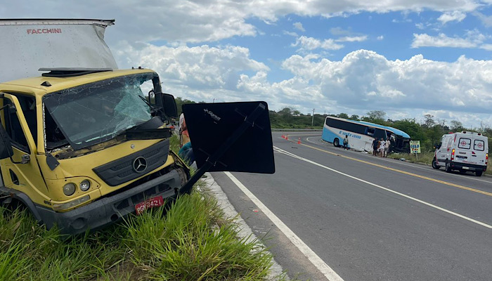 Colisão entre caminhão e ônibus deixa dois mortos na BR-324, entre Feira de Santana e Tanquinho