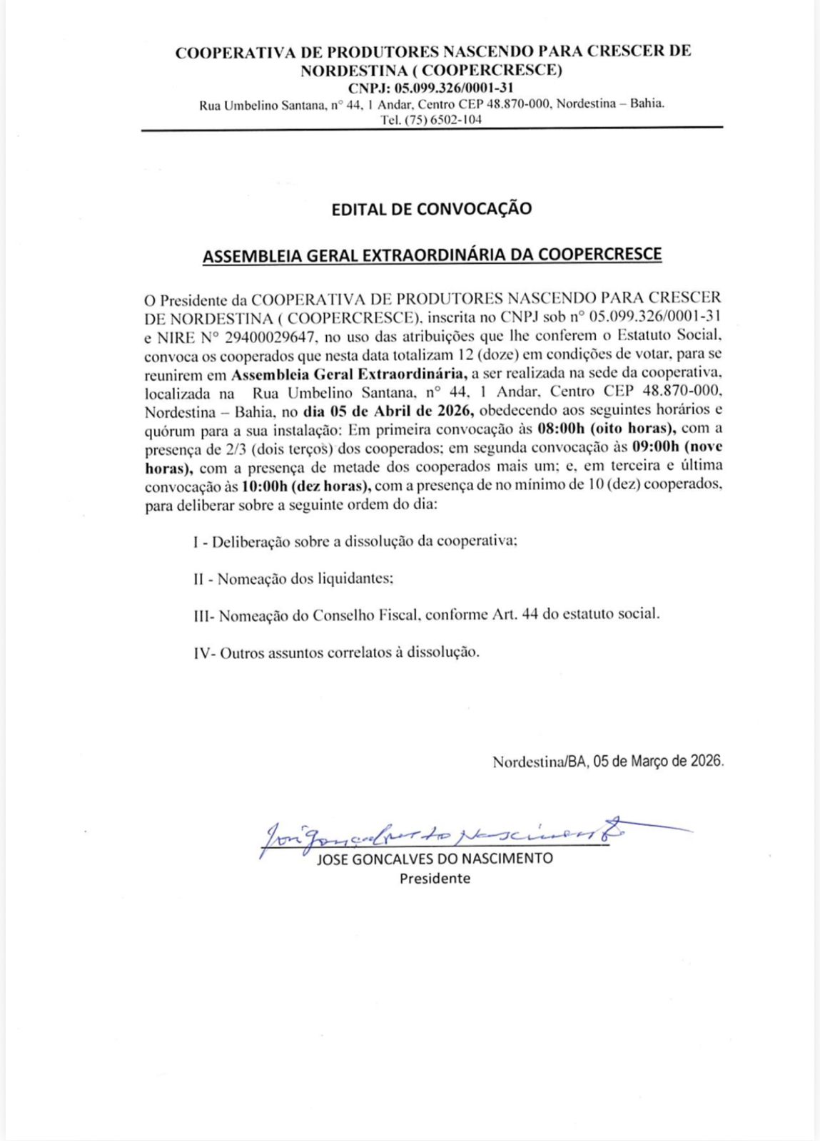 O edital foi assinado pelo presidente da cooperativa, José Gonçalves do Nascimento, e datado de 5 de março de 2026, no município de Nordestina.