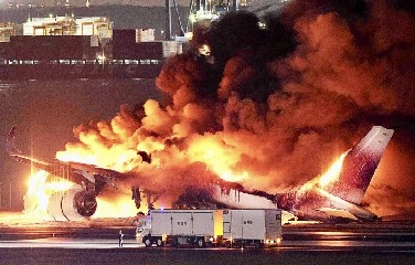 Um avião da Japan Airlines com 367 passageiros e 12 tripulantes pegou fogo após bater em uma aeronave da Guarda Costeira do Japão na pista do ae...